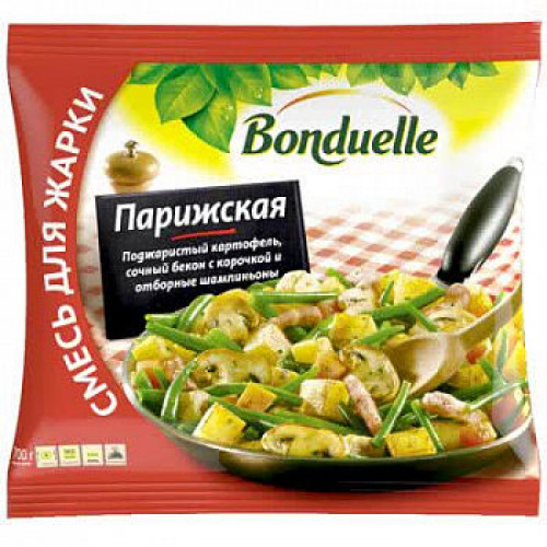 Cостав: Cтручковая фасоль; картофель предварительно обжаренный; бекон; морковь; шампиньоны; лук. при температуре от 0 °С до +4 °С – 24 часа; при температуре -18°С употребить до конца даты, указанной на упаковке.